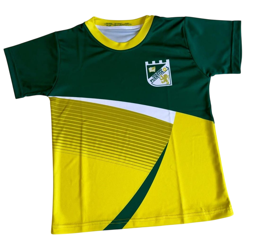 Camiseta de manga corta verde y amarilla con escudo del colegio.